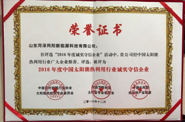 此次誠信獎,用行業(yè)協(xié)會主任張曉黎的話來講,沒有經(jīng)過網(wǎng)絡(luò)的投票,而是根據(jù)企業(yè)在多年的經(jīng)營過程中,同行、客戶以及上下游供應(yīng)商對企業(yè)的綜合評價。十年來,同陽新能源憑借著高品質(zhì)產(chǎn)品、完善的服務(wù)和規(guī)范的管理,先后榮獲“質(zhì)量信譽雙障示范單位”、“中國315 質(zhì)量誠信示范單位”、山東省內(nèi)養(yǎng)老院、學(xué)校、醫(yī)院太陽能集熱系統(tǒng)財務(wù)補貼項目供貨企業(yè)榮譽,并通過ISO9001 國際質(zhì)量認(rèn)證、3C 認(rèn)證、國家康居認(rèn)證;獲中國太陽能熱利用設(shè)計、施工B 級證書,連續(xù)多年被評為“中國太陽能熱利用產(chǎn)業(yè)聯(lián)盟推薦產(chǎn)品”、“山東省消費者協(xié)會滿意品牌”、“億家同陽”品牌被山東省工商局評定為山東省著名商標(biāo)。而這些榮譽恰恰印證了億家同陽誠信經(jīng)營,誠信守信的本色。