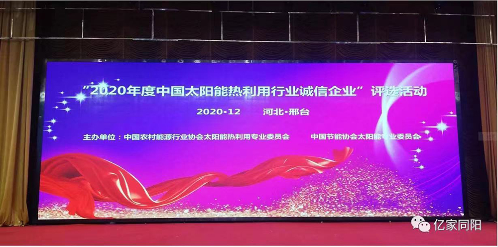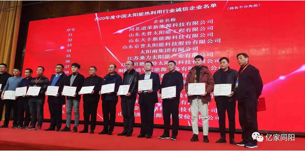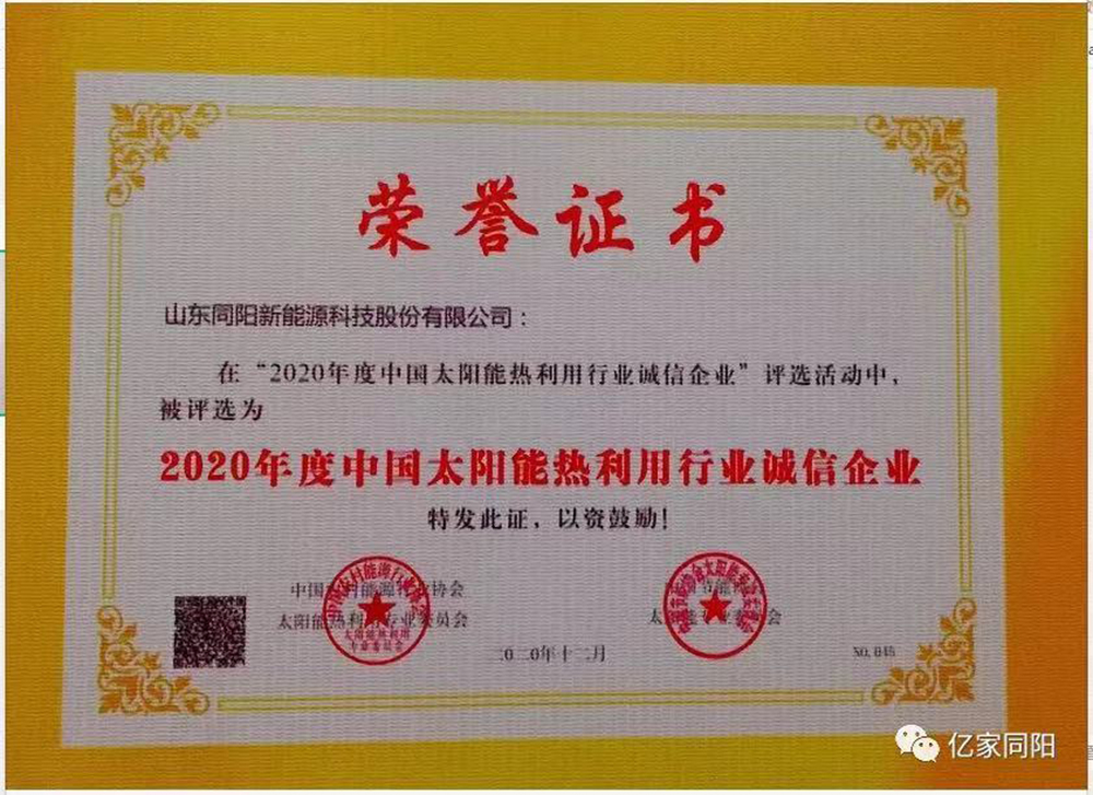 山東同陽新能源科技股份有限公司始終將“以誠取勝”作為企業(yè)生存之本,憑借強(qiáng)烈的誠信意識,弘揚(yáng)誠實守信風(fēng)尚、推動行業(yè)誠信體系建設(shè),再次榮獲“2020年度中國太陽能熱利用行業(yè)誠信企業(yè)”稱號。