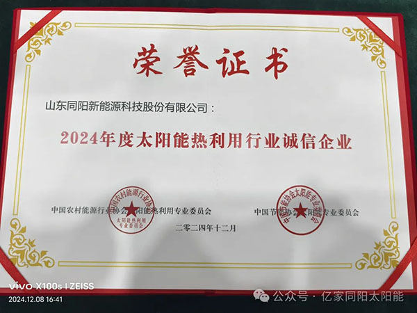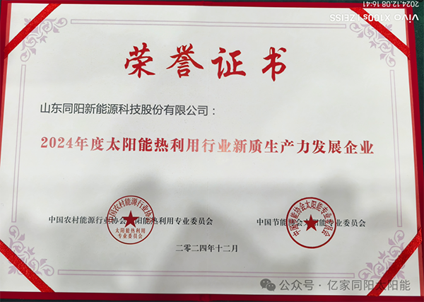 本次行業(yè)年會(huì),山東同陽(yáng)新能源科技股份有限公司董事長(zhǎng)陳永峰、總經(jīng)理姜仁良、財(cái)務(wù)總監(jiān)張瑞娟出席。會(huì)上,山東同陽(yáng)新能源科技股份有限公司憑借獨(dú)具匠心的產(chǎn)品品質(zhì),誠(chéng)實(shí)守信的經(jīng)營(yíng)原則,榮獲“2024年度太陽(yáng)能熱利用行業(yè)誠(chéng)信企業(yè)”及“2024年度太陽(yáng)能熱利用行業(yè)新質(zhì)生產(chǎn)力發(fā)展企業(yè)”等榮譽(yù)稱(chēng)號(hào),億家同陽(yáng)再次獲得此稱(chēng)號(hào),是企業(yè)產(chǎn)品質(zhì)量、誠(chéng)信經(jīng)營(yíng)等綜合實(shí)力又一次受到全國(guó)性專(zhuān)業(yè)組織肯定的明證。