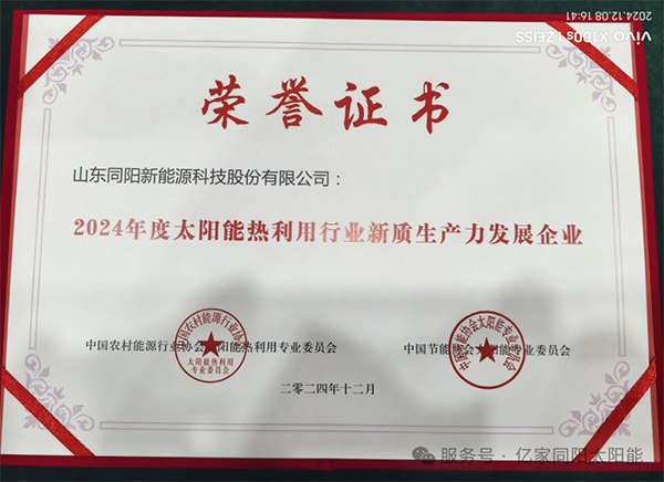 在本屆年會上,億家同陽榮獲由中國農村能源行業(yè)協會太陽能熱利用專業(yè)委員會與中國節(jié)能協會太陽能專業(yè)委員會共同頒發(fā)的“2024年度太陽能熱利用行業(yè)誠信單位”、“2024年度太陽能熱利用行業(yè)新質生產力發(fā)展企業(yè)”兩大榮譽稱號。
