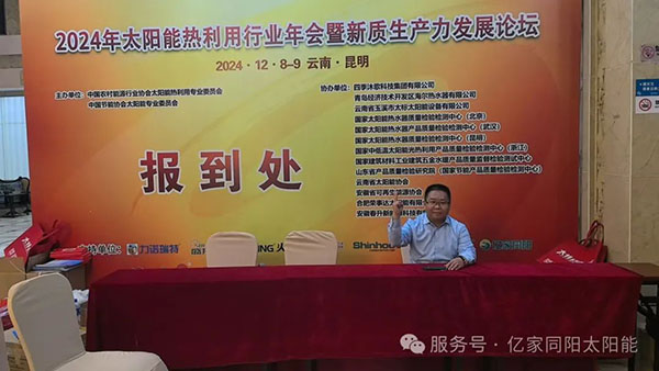 12月8-9日,山東同陽新能源科技股份有限公司受邀參加了2024年太陽能熱利用行業(yè)年會,公司董事長陳永峰、總經理姜仁良、財務總監(jiān)張瑞娟出席。在會上,姜總以“扎根行業(yè) 服務行業(yè)”做主題演講,強調了億家同陽將以全心全意為客戶和行業(yè)服務的理念發(fā)展下去。與此同時,億家同陽借行業(yè)年會之機,傳承這份陽光之志,與行業(yè)同仁再敘陽光之情!