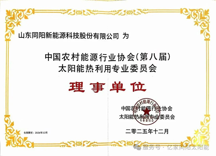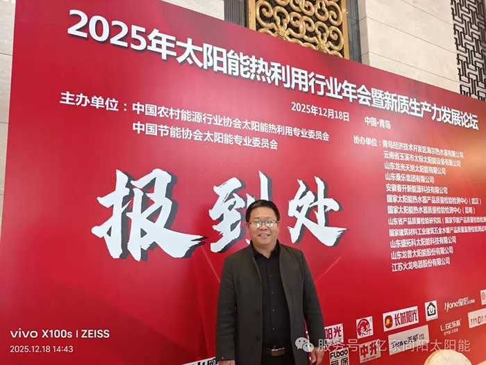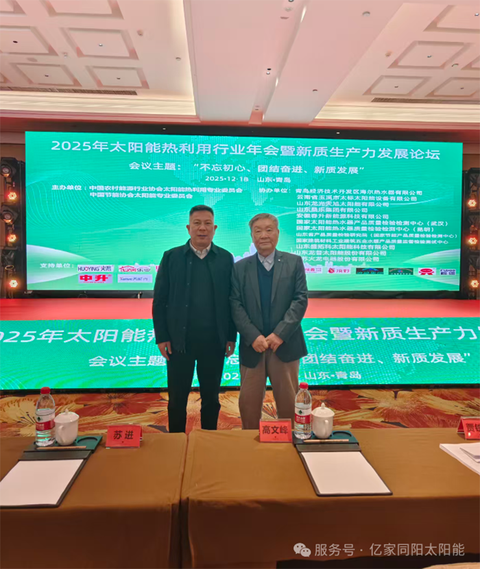 2025年12月18日,由中國(guó)農(nóng)村能源行業(yè)協(xié)會(huì)太陽(yáng)能熱利用專業(yè)委員會(huì)和中國(guó)節(jié)能協(xié)會(huì)太陽(yáng)能專業(yè)委員會(huì)聯(lián)合主辦的“2025年中國(guó)太陽(yáng)能熱利用行業(yè)年會(huì)”在山東青島隆重召開(kāi)。山東同陽(yáng)新能源科技股份有限公司董事長(zhǎng)陳永峰、總經(jīng)理姜仁良、北方營(yíng)銷中心胡乃武、魯中營(yíng)銷中心司雨受邀出席,與行業(yè)同仁共襄盛舉,認(rèn)真貫徹、執(zhí)行黨的“二十屆四中”會(huì)議精神,為行業(yè)高質(zhì)量發(fā)展注入同陽(yáng)力量。